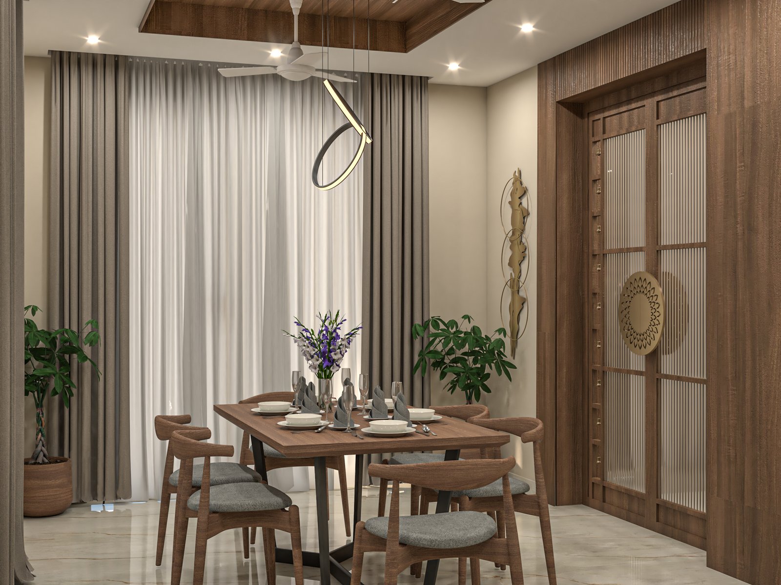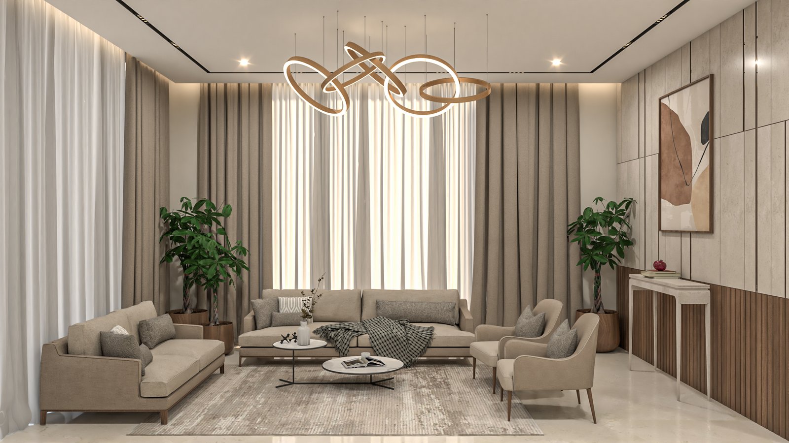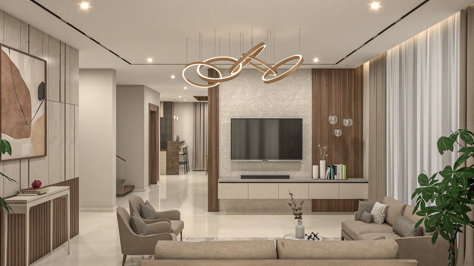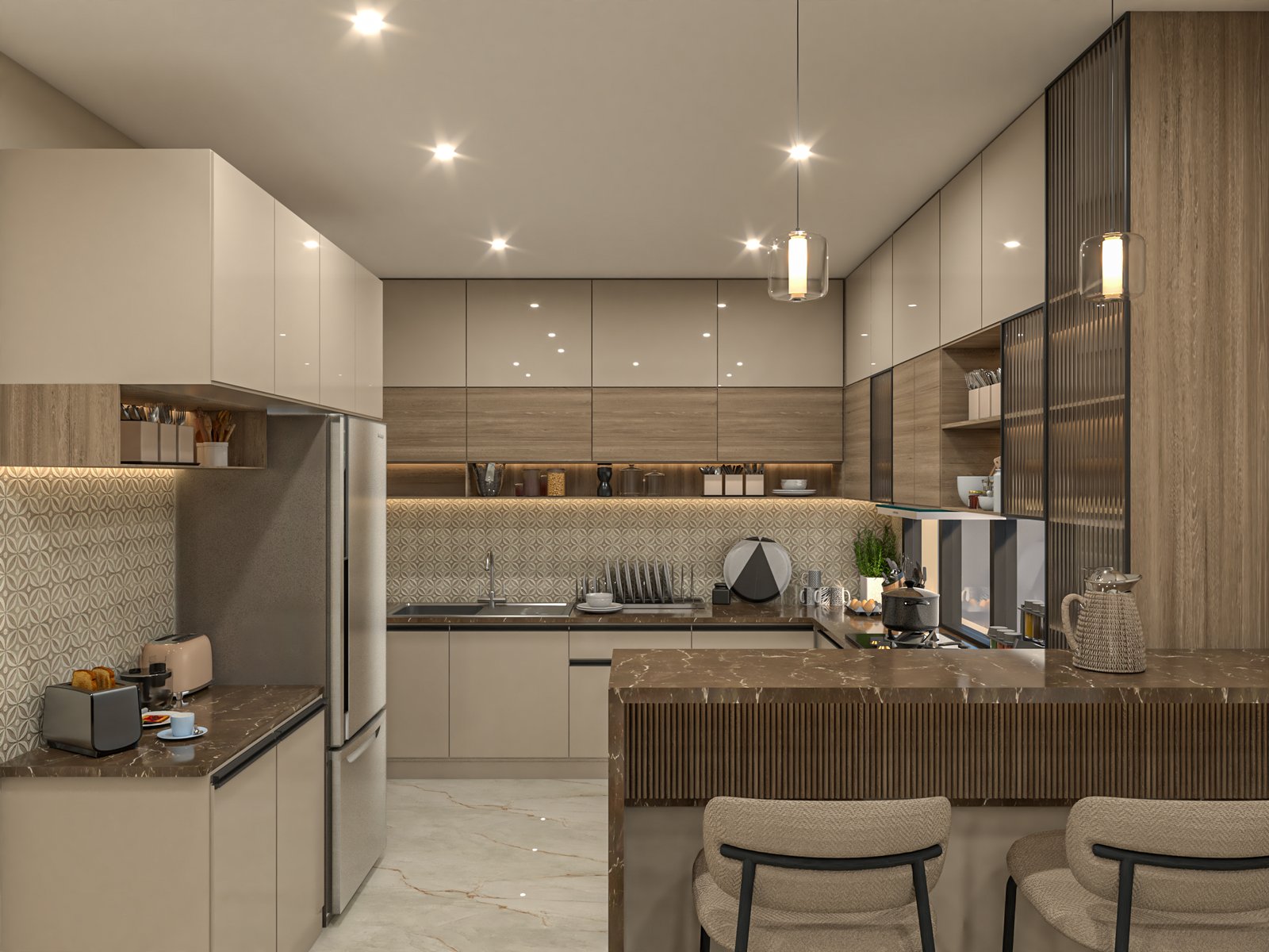 The interior design of this residence is a composition of modern functionality and serene elegance. This project utilizes a sophisticated and cohesive palette of earthy tones, featuring warm wood accents, polished marble flooring and soft beige and cream textures throughout the living spaces and bedrooms. The design is characterized by its clean lines and minimalist approach, with bespoke elements such as the striking fluted wood paneling in the living area and dining space and the decorative partition that separates the master bedroom from its walk-in closet. Thoughtful lighting, from recessed ceiling fixtures to unique, sculptural pendant lights, enhances the inviting and contemporary ambiance of the home. Each room is meticulously crafted to blend comfort with a refined, uncluttered aesthetic, making every space a perfect balance of luxury and comfort.