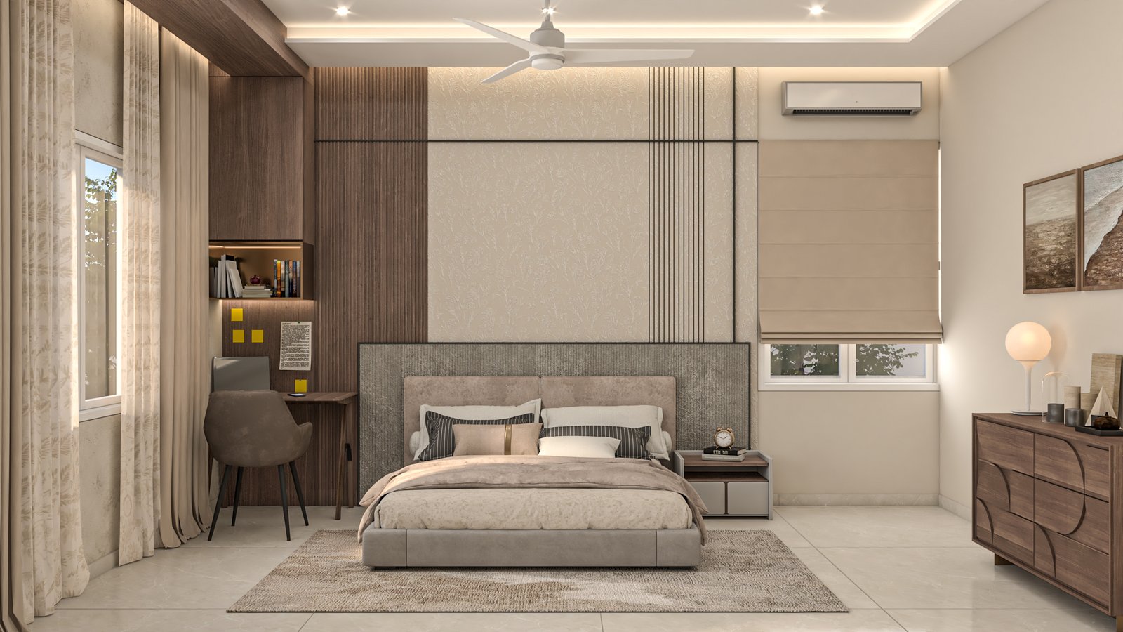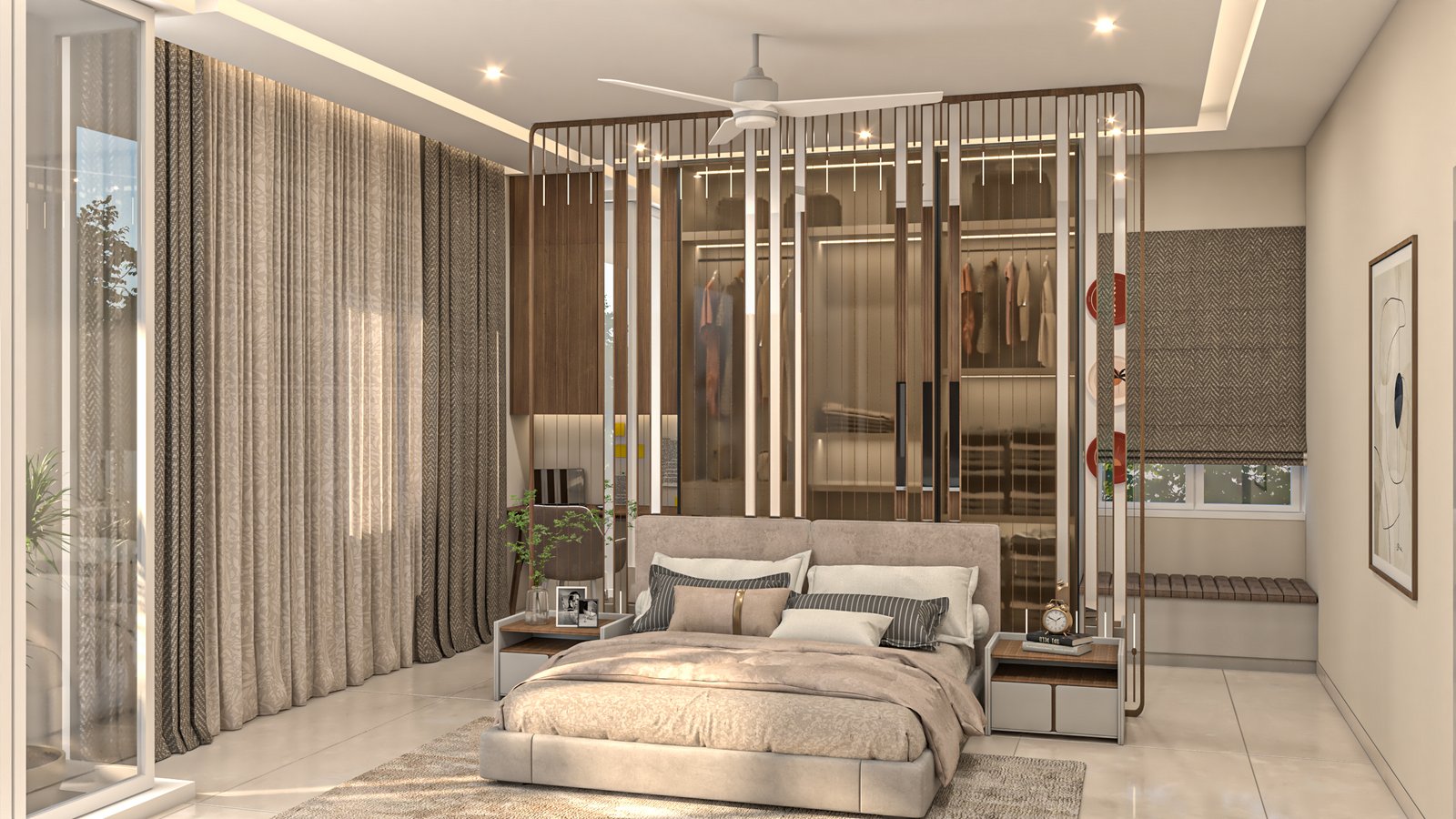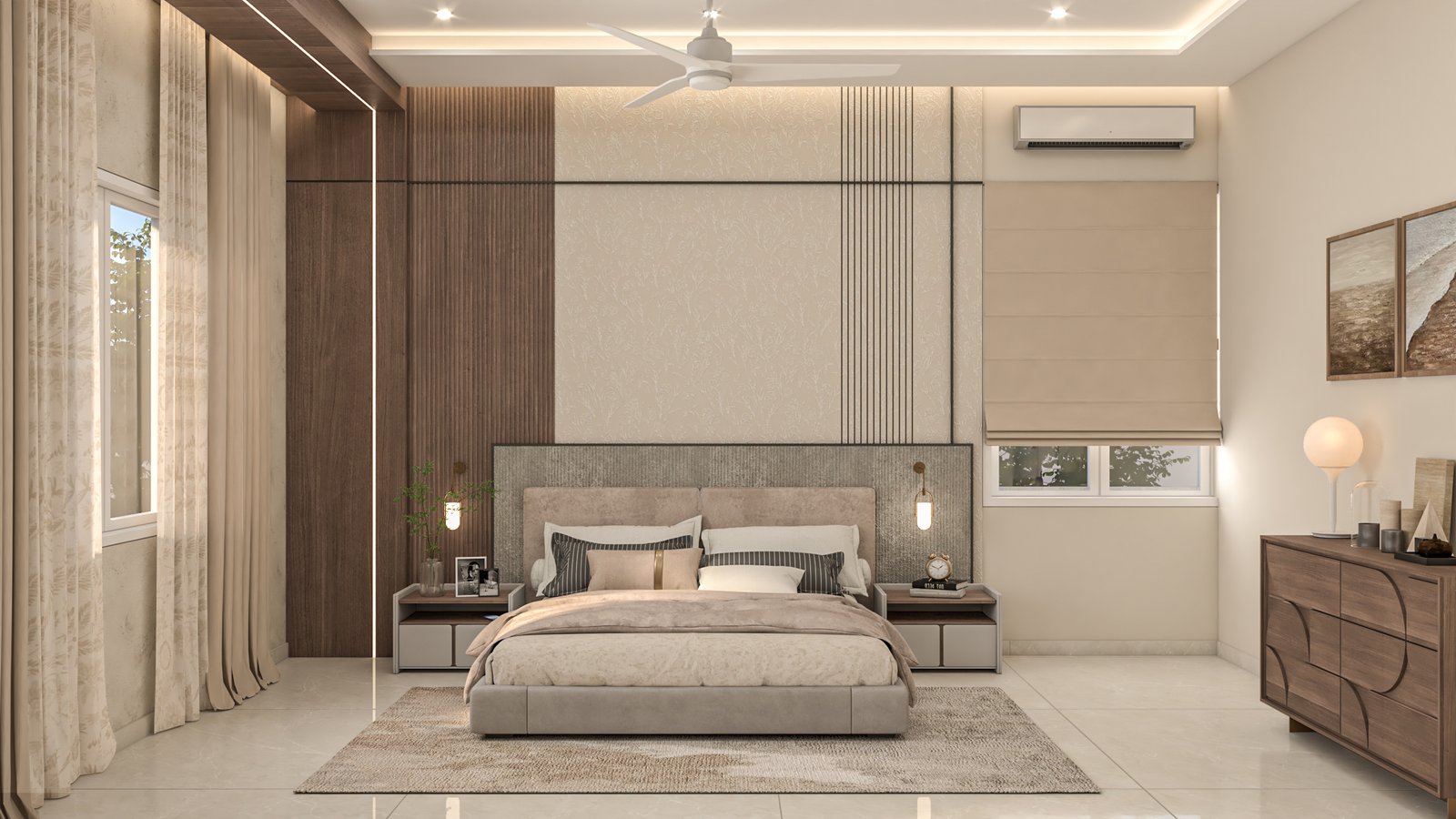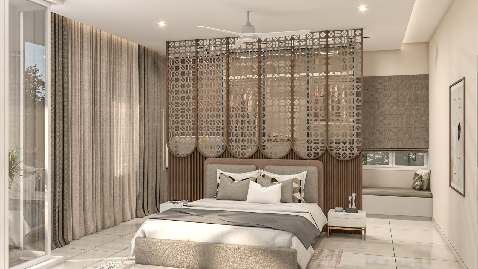 The interior design of this residence is a composition of modern functionality and serene elegance. This project utilizes a sophisticated and cohesive palette of earthy tones, featuring warm wood accents, polished marble flooring and soft beige and cream textures throughout the living spaces and bedrooms. The design is characterized by its clean lines and minimalist approach, with bespoke elements such as the striking fluted wood paneling in the living area and dining space and the decorative partition that separates the master bedroom from its walk-in closet. Thoughtful lighting, from recessed ceiling fixtures to unique, sculptural pendant lights, enhances the inviting and contemporary ambiance of the home. Each room is meticulously crafted to blend comfort with a refined, uncluttered aesthetic, making every space a perfect balance of luxury and comfort.