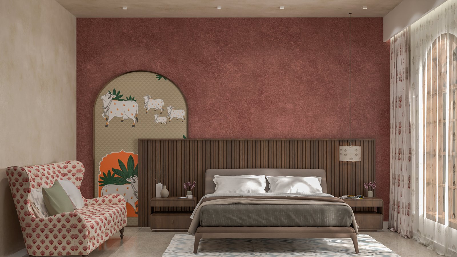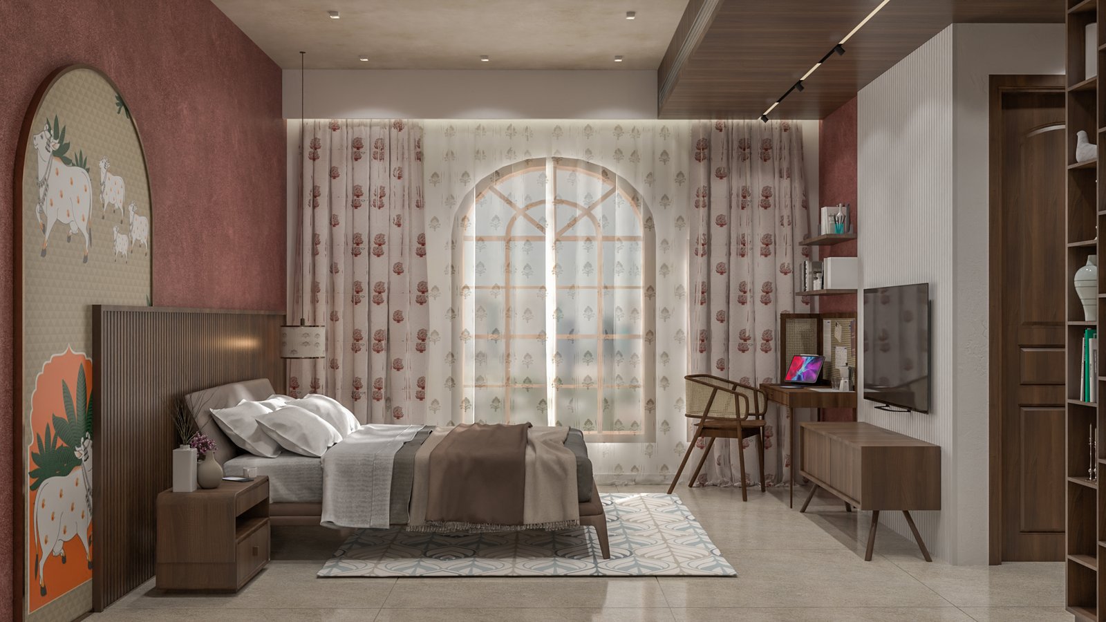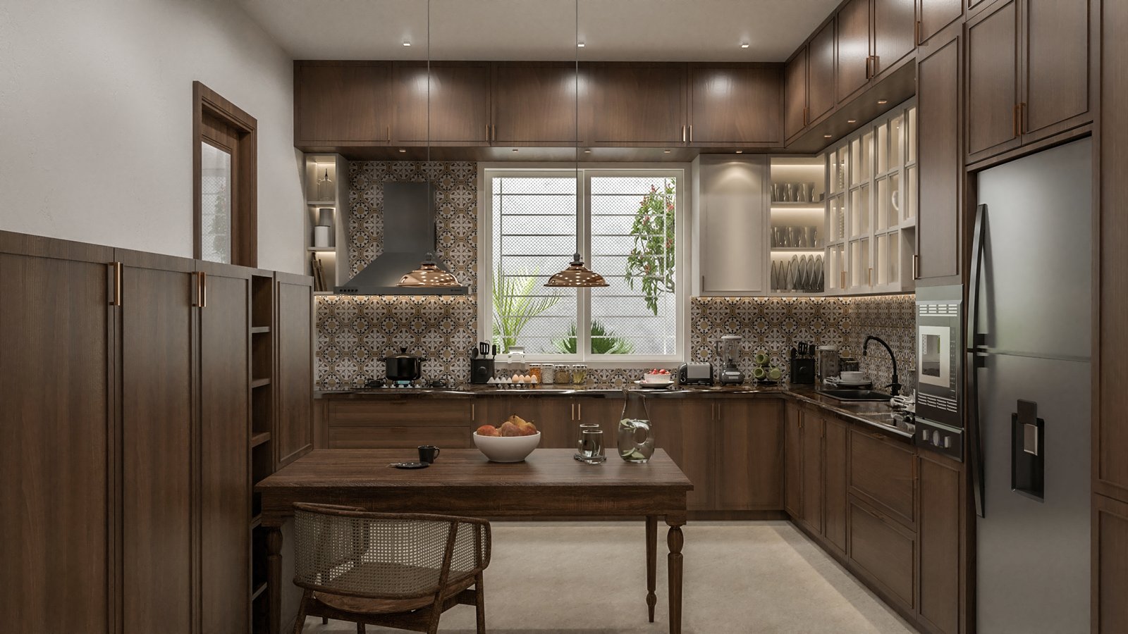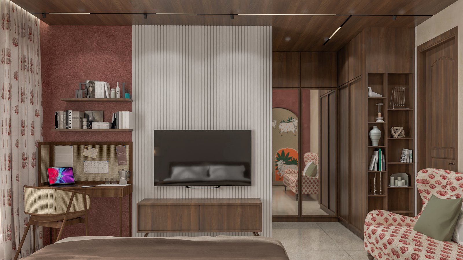 Designed to reflect the personality and lifestyle of its residents, this Chennai home is a showcase of timeless elegance. Each space has been crafted to balance sophisticated comfort with functionality. The design balances a neutral base palette, featuring warm whites, soft grays, and rich wood tones, with carefully placed accents of color and texture. The living area is characterized by a minimalist, uncluttered aesthetic, with sleek, clean-lined furniture and a modern TV unit. In contrast, the bedroom embraces a playful yet refined theme. The kitchen combines glossy, modern cabinetry with natural wood finishes, creating a functional and inviting space. The thoughtful integration of diverse textures, from subtle wall treatments to polished surfaces, ensures each room feels cohesive while maintaining its own unique personality and purpose.