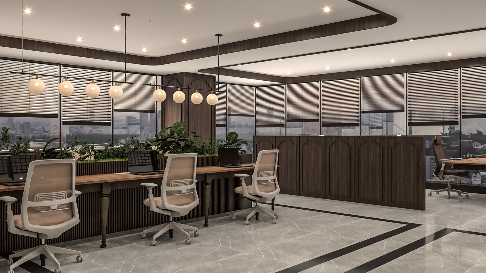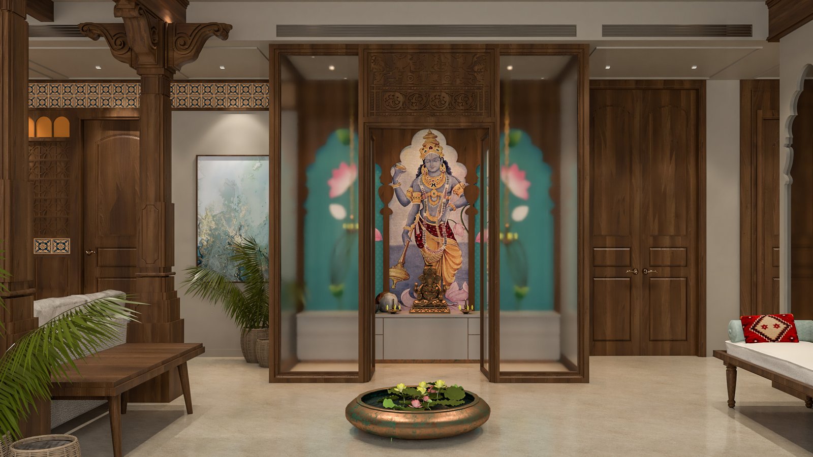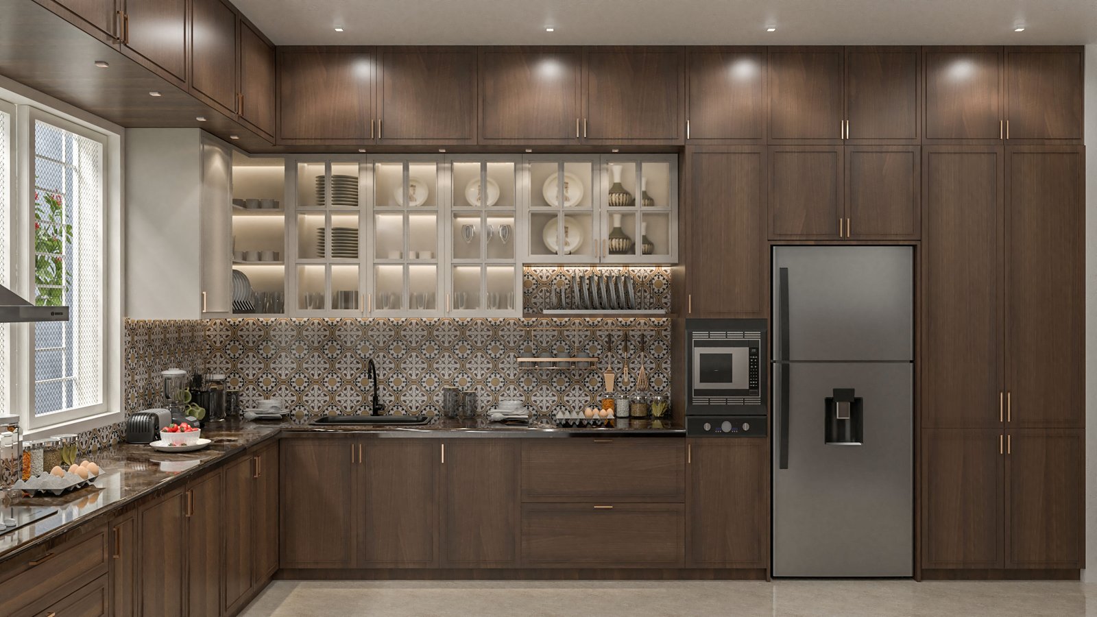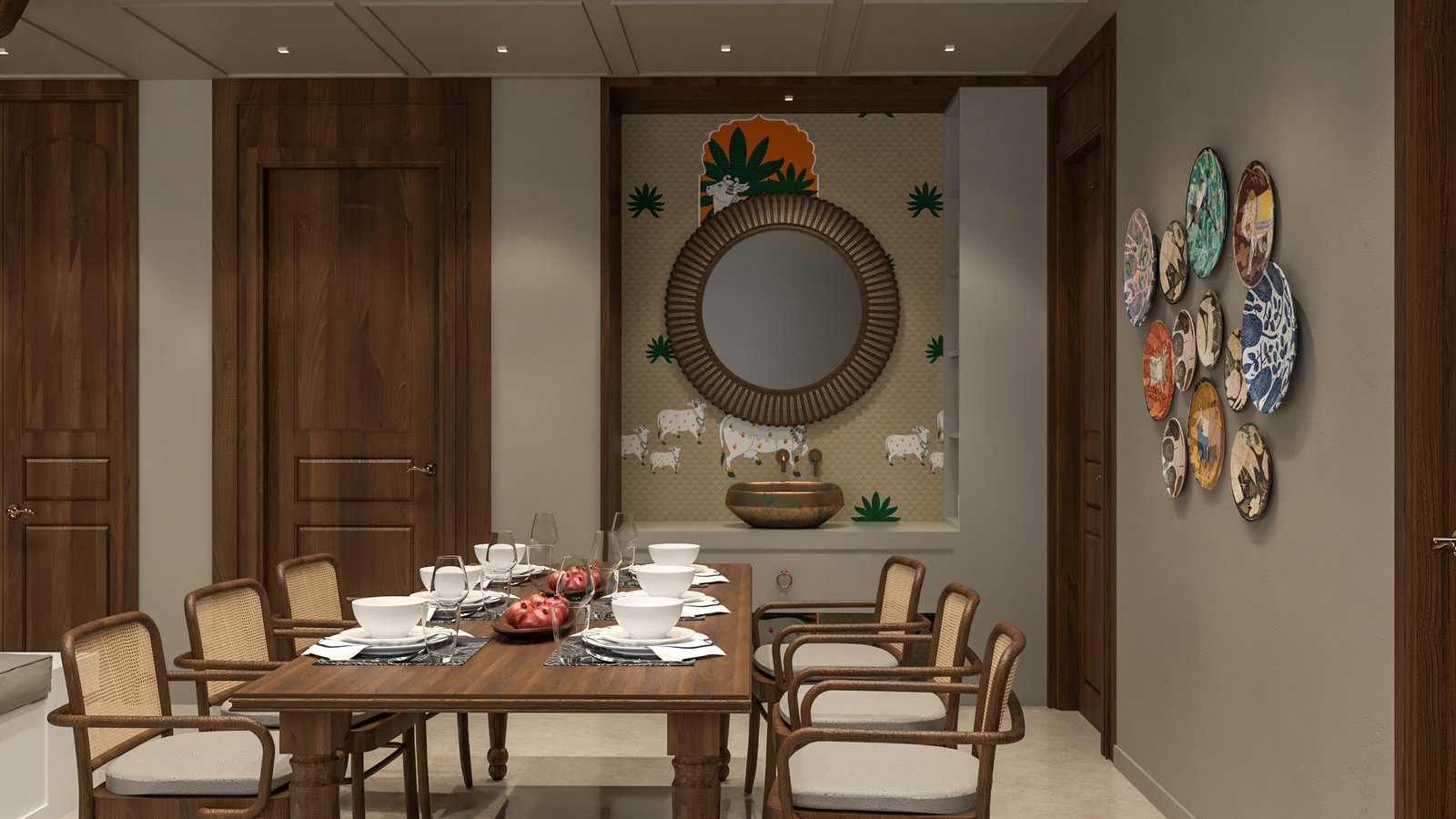 Designed to reflect the personality and lifestyle of its residents, this Chennai home is a showcase of timeless elegance. Each space has been crafted to balance sophisticated comfort with functionality. The design balances a neutral base palette, featuring warm whites, soft grays, and rich wood tones, with carefully placed accents of color and texture. The living area is characterized by a minimalist, uncluttered aesthetic, with sleek, clean-lined furniture and a modern TV unit. In contrast, the bedroom embraces a playful yet refined theme. The kitchen combines glossy, modern cabinetry with natural wood finishes, creating a functional and inviting space. The thoughtful integration of diverse textures, from subtle wall treatments to polished surfaces, ensures each room feels cohesive while maintaining its own unique personality and purpose.